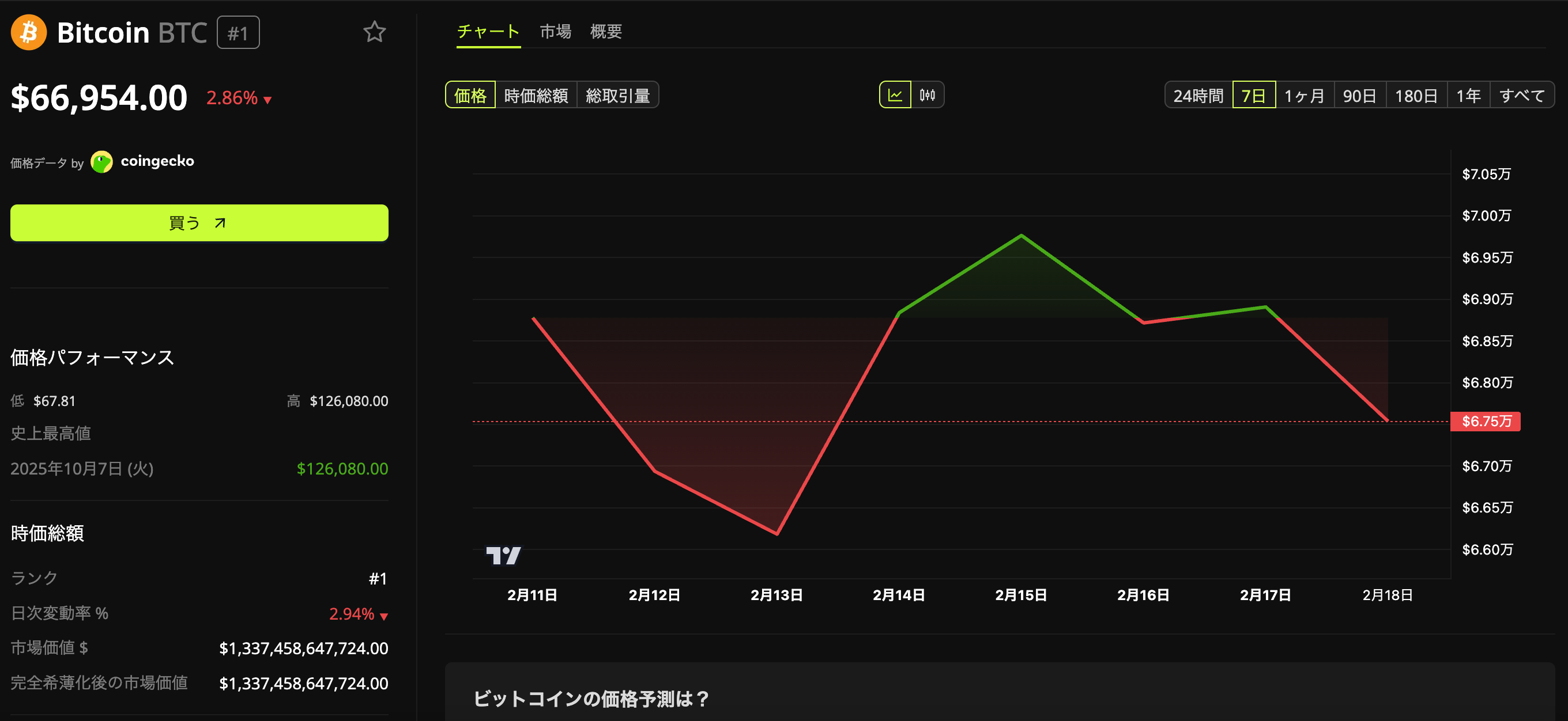 一方、ビットコインのドル建て価格は同時期に反発基調で、2月12日頃は約6万6000ドル前後で推移していたのに対し、17日には約6万8000ドル台まで値を戻した。投資家心理としては、BTCの上昇基調と株価の動きが必ずしも同一方向に連動していないことが示された格好だ。