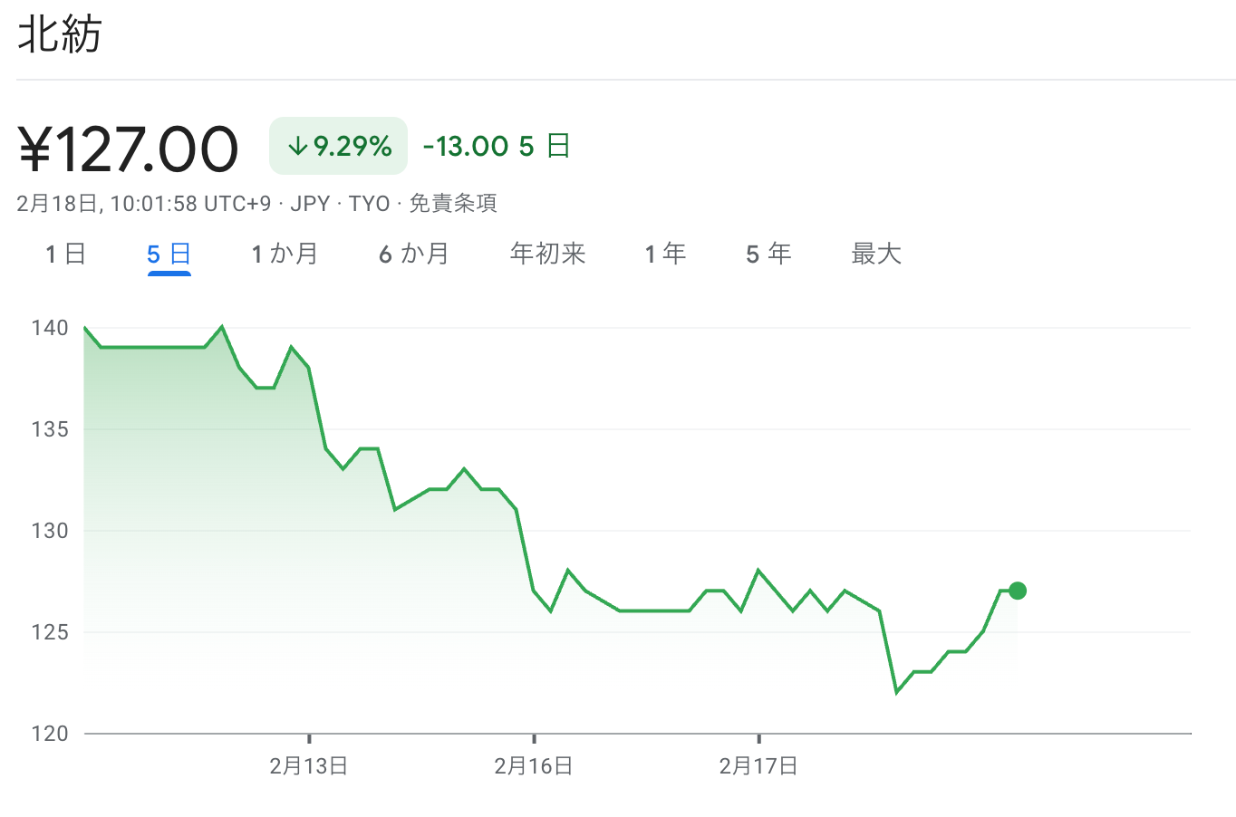 直近の株価推移を見てみると、北紡株は2026年2月12日の終値138円に対し、翌13日の終値は131円と続落した後、2月16日には126円まで下げ幅を広げた。さらに17日終値は124円と、短期的には弱い動きが続いた。
