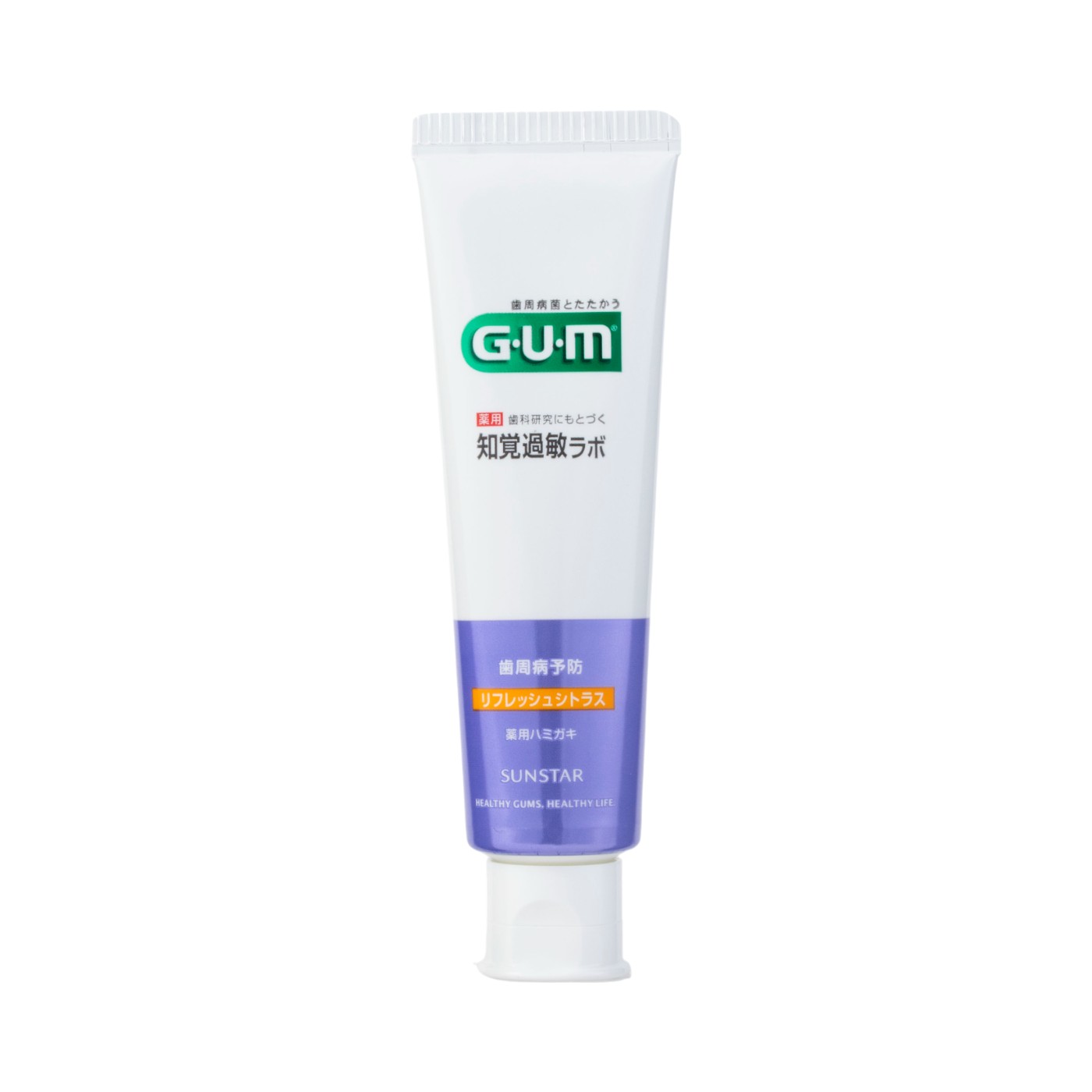 サンスターの「G・U・M リフレッシュシトラス」は、歯周病を防ぎ、ダブルのしみるバリア成分で 歯がしみるのも防ぐと謳う薬用ハミガキです。殺菌有効成分の塩化セチルピリジニウムと抗炎症成分のグリチルリチン酸2Kにより歯周病を予防する設計も特徴。リフレッシュシトラスの香味が口内に爽やかさを与えます。知覚過敏の症状を防ぐ成分として、乳酸アルミニウムと硝酸カリウムの2種類が配合されていることを確認しました。冷たいものがしみやすい人や、知覚過敏に悩む人に適した処方といえます。フッ素濃度は1,450ppmで、研磨剤(清掃剤)も含まれていることがわかりました。虫歯予防と汚れ除去の両面に配慮された設計です。研磨剤により露出した象牙質を傷つける可能性があるものの、高濃度フッ素で虫歯予防を重視したい人や、着色汚れが気になる人に向いています。モニターからは、ザラつき・ヌルつきの少なさが好印象。泡立ちや使用後の爽快感はさほど強くなかったものの、強すぎないリフレッシュシトラスの香りには、「毎日使いたい」「クセがない」と好評でした。日常的なオーラルケアとして取り入れやすいでしょう。