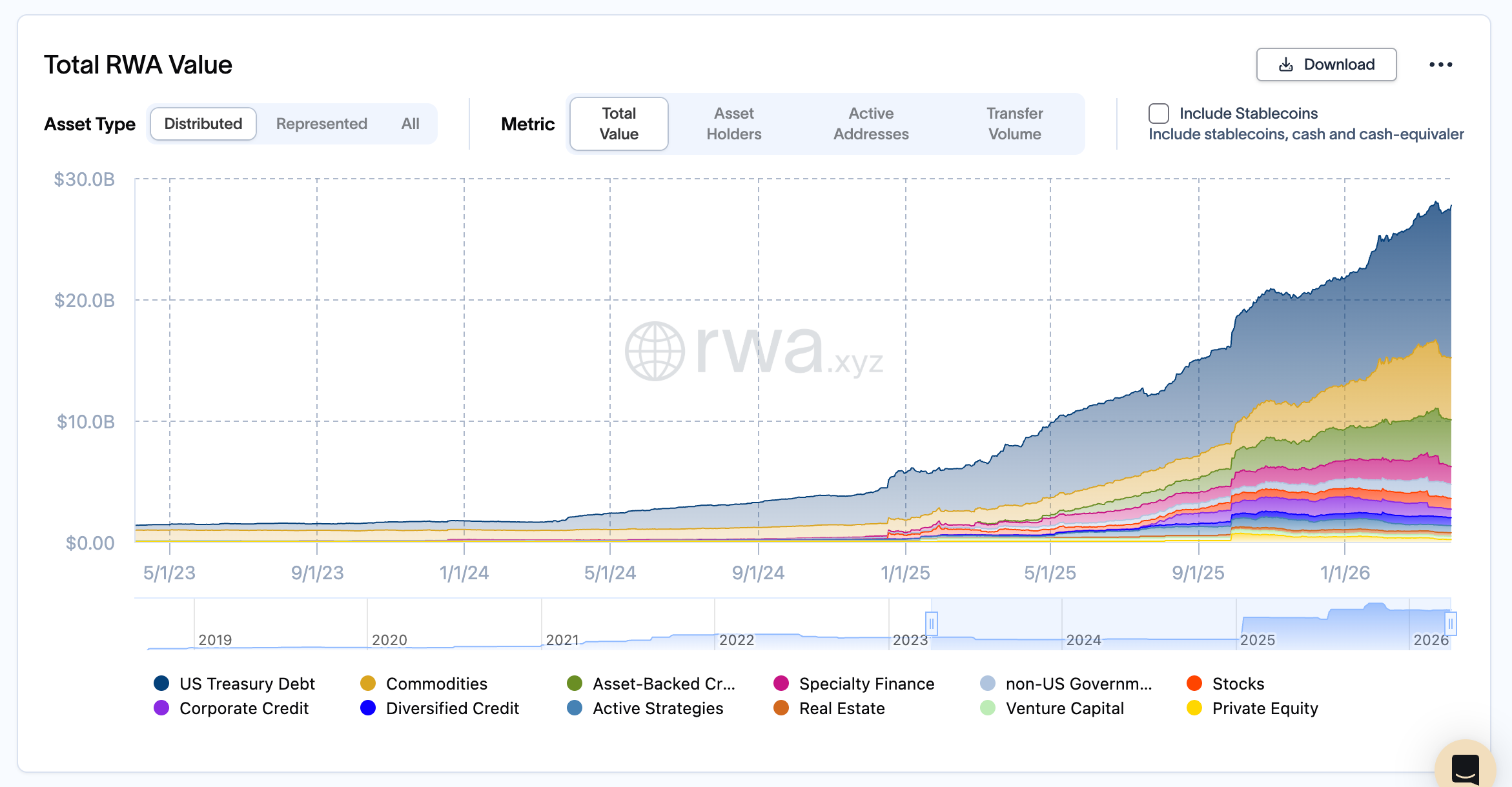 こうした実体経済の混乱と並行して、暗号資産業界では現実資産(RWA)のトークン化が急速に制度化・主流化しつつある。ブロックチェーン上で実物資産の所有権をデジタルトークンとして表章し、分割・売買・担保活用を可能にするRWA(Real World Asset)のオンチェーン分散資産価値は、2026年3月時点で約270億ドル規模に達している(rwa.xyz)。直近数年間の市場拡大は著しく、過去1年だけでおよそ4倍の規模に成長したとされる。