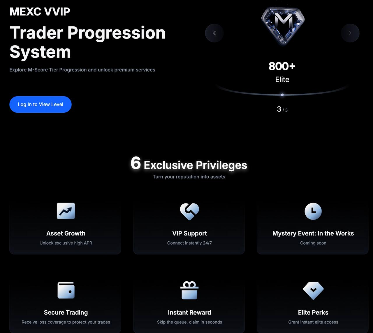 MEXC VVIPプログラムは、従来の静的なVIPモデルに代わり、動的なスコアリングメカニズムを採用した新しいユーザー成長・報酬プログラムです。独自の指標であるM-Scoreを通じて、ユーザーの取引高、アクティビティレベル、およびセキュリティ評価を総合的に評価し、そのスコアに基づいて自動的にレベルと特典を割り当てます。