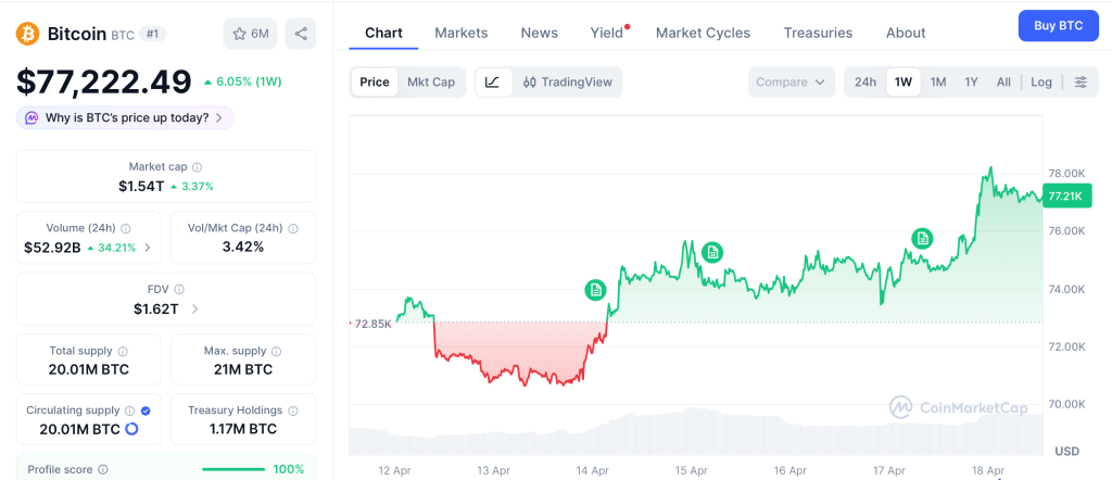 The Bitcoin price traded near $77,222 on April 17 per CoinMarketCap, holding gains while Citigroup’s portfolio study signals banks are no longer testing crypto, they are folding it into core research desks.