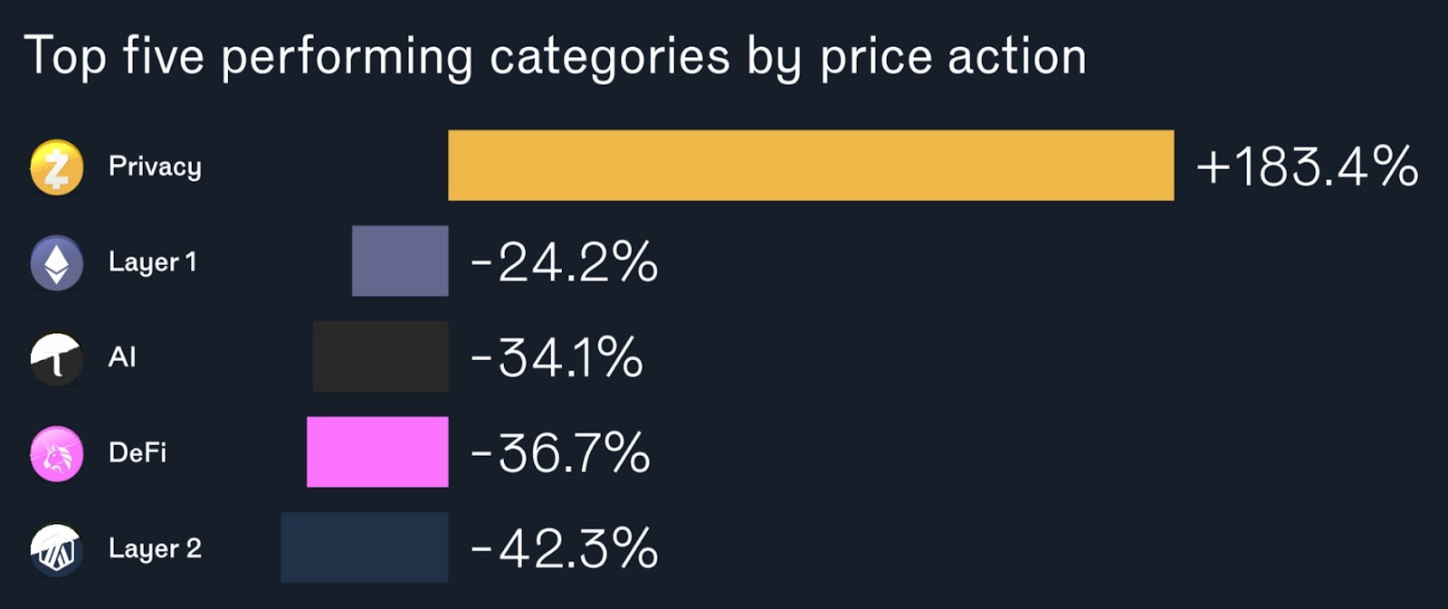 In terms of price action, there was one huge winner in Q4 — privacy coins, led by ZCash (ZEC). Through Q4, Zcash’s price surged by over 600%, largely driven by privacy concerns around Bitcoin.