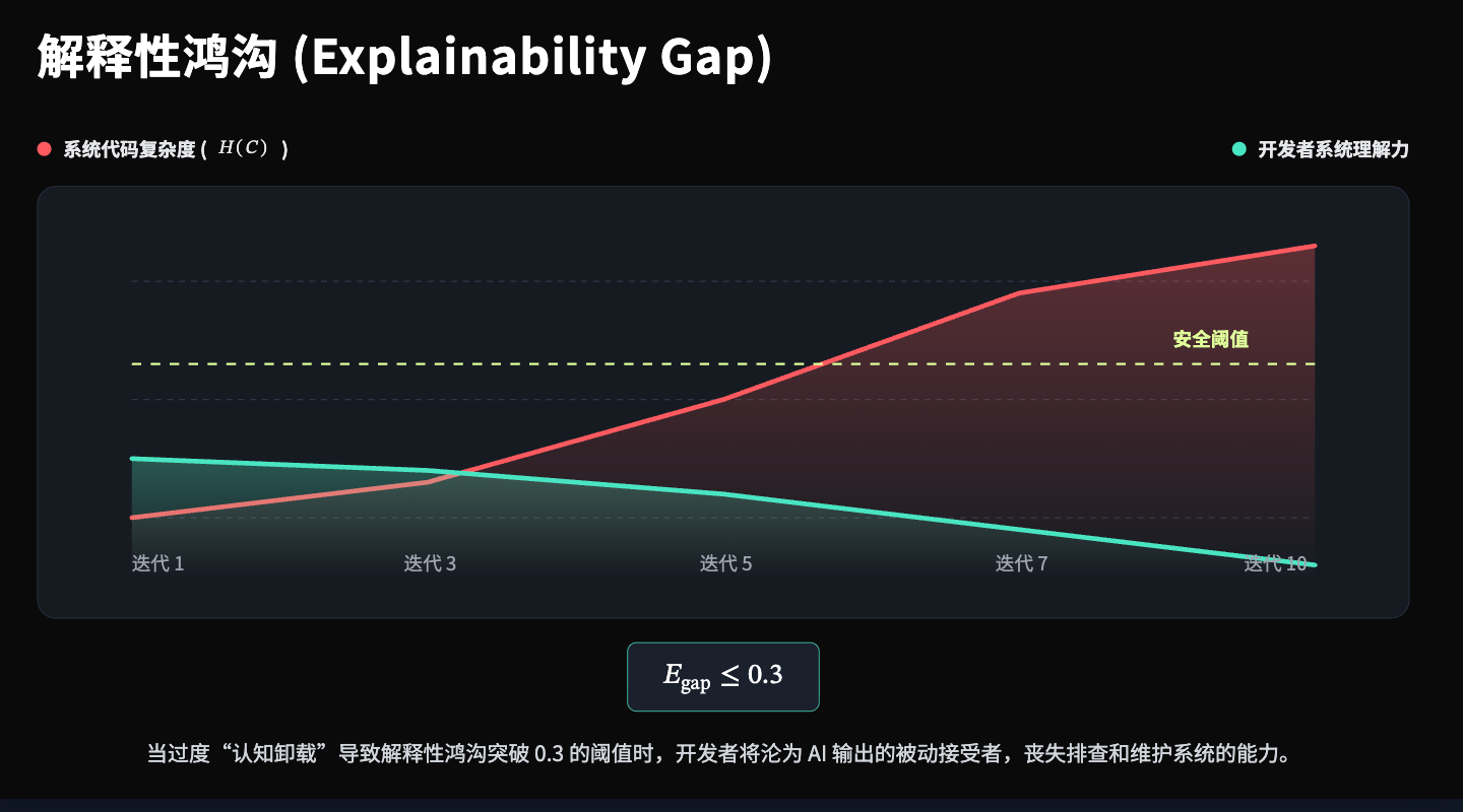 然而,认知卸载的过度使用会导致一个被称为“解释性鸿沟(Explainability Gap, 简称 $E_{gap}$)”的严重问题。随着 AI 不断生成大量代码,系统的代码复杂度 $$H(C$$ 呈指数级上升。当开发者的系统理解力无法跟上代码复杂度的增长速度时,这个系统就彻底失控了。相关研究表明,$E_{gap}$ 必须作为一个极其关键的控制变量受到严密监控。只有当 $$E_{gap$$ 保持在 0.3 的安全阈值以下时——即学生的理解程度与代码复杂度的匹配度极高时——AI 编程方法论才能真正提升学习成果和工程质量。一旦突破这一阈值,开发者便会彻底沦为 AI 输出的被动接受者,丧失了排查故障和优化系统的能力。