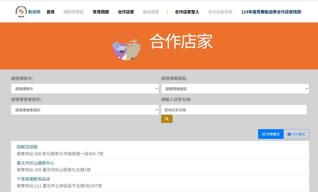 ▲前往動滋網的「合作店家」能夠找到運動幣的適用場所。