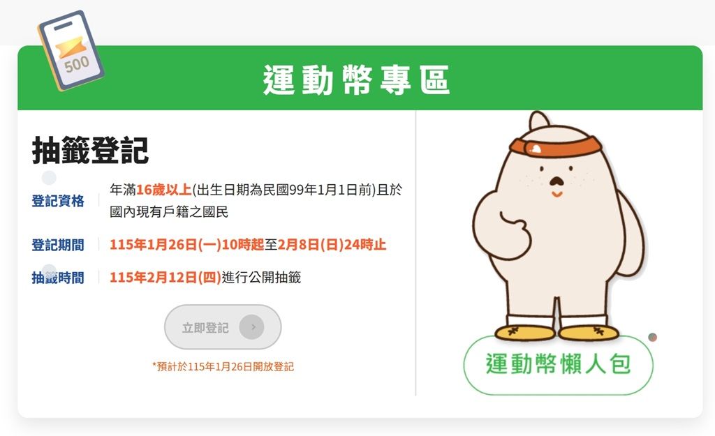 ▲年滿16歲以上國民皆可參與運動幣抽選登記。運動幣抽選將於1月26日開放登記,且前5日採身分證尾數分流措施。圖片來源