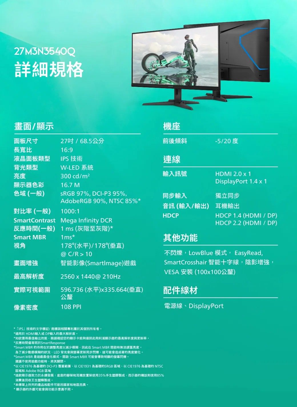 ▲螢幕支援Fast IPS技術,能讓螢幕有更好的影像表現。▲螢幕最高更新率為210Hz,反應時間為1ms。▲螢幕支援護眼技術,也是此螢幕的特點。▲支援多種輸入介面,並且可使用壁掛功能。▲支援低輸入延遲,避免延遲影響遊戲表現。▲詳細規格如上。