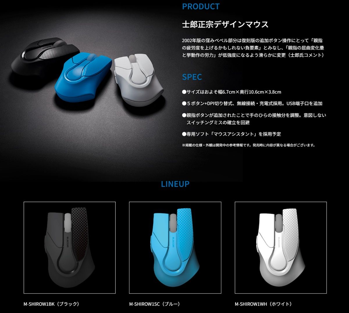 M-SHIROW1由攻殼機動隊作者士郎正宗親自操刀,以2002年的M.A.P.P設計滑鼠進行微調,其中將原本影響人體工學的拇指區的傾斜線條調整為更舒適的形狀,同時也因應現代主流滑鼠設計添加可切換上下頁的拇指鍵與DPI切換鍵;此外畢竟2002年版本的M.A.P.P仍是採用PS2介面,M-SHIROW1則預計改為全新光學感測器以及無線連接,並採用內建鋰電池。
