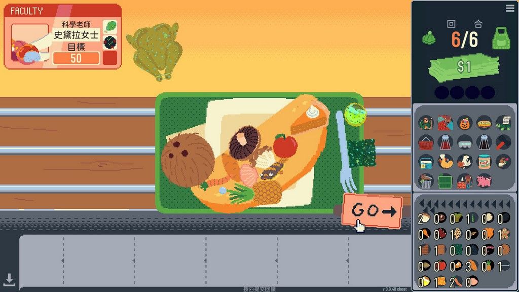 ▲Steam遊戲你有餅嗎,玩家將扮演學校餐廳廚師製作蛋餅。遊戲每回合擺放食材的次數有限,且食材將從食材庫中隨機送出,玩家必須想辦法發揮食材互相搭配的效果,追求高分。▲遊戲食材種類有很多,有機會出現例如整顆椰子、整塊蛋糕、發霉食材、垃圾袋等。玩家可以自行選擇想要構築的流派,即使端出發霉料理或是垃圾袋也有機會通關。▲在每回合結束後,玩家可以在商店購買食材,增加食材庫中的種類。在商店裡也能看見接下來幾位客人的喜好或特殊要求。▲在購入食材以外,玩家也能夠在商店購買到特殊的加乘道具。例如下一回合滿足指定條件可以讓分數倍數成長,或是可以讓玩家忽略某些負面效果等。▲每個食材都有不同的特性,且部分特性和擺放位置有關,例如某種食材互相接觸能夠加分、擺放在所有食材的最上面可以加分、覆蓋幾項食材加幾分等等。部分食材本身沒有分數,須要互相搭配才能發揮。▲玩家必須要將食材擺放在歐姆蛋上才能獲得分數。歐姆蛋的空間有限且食材大小不一,也有可能會觸發食材變大或變小的效果,因此如何擺放也是有趣的一環。