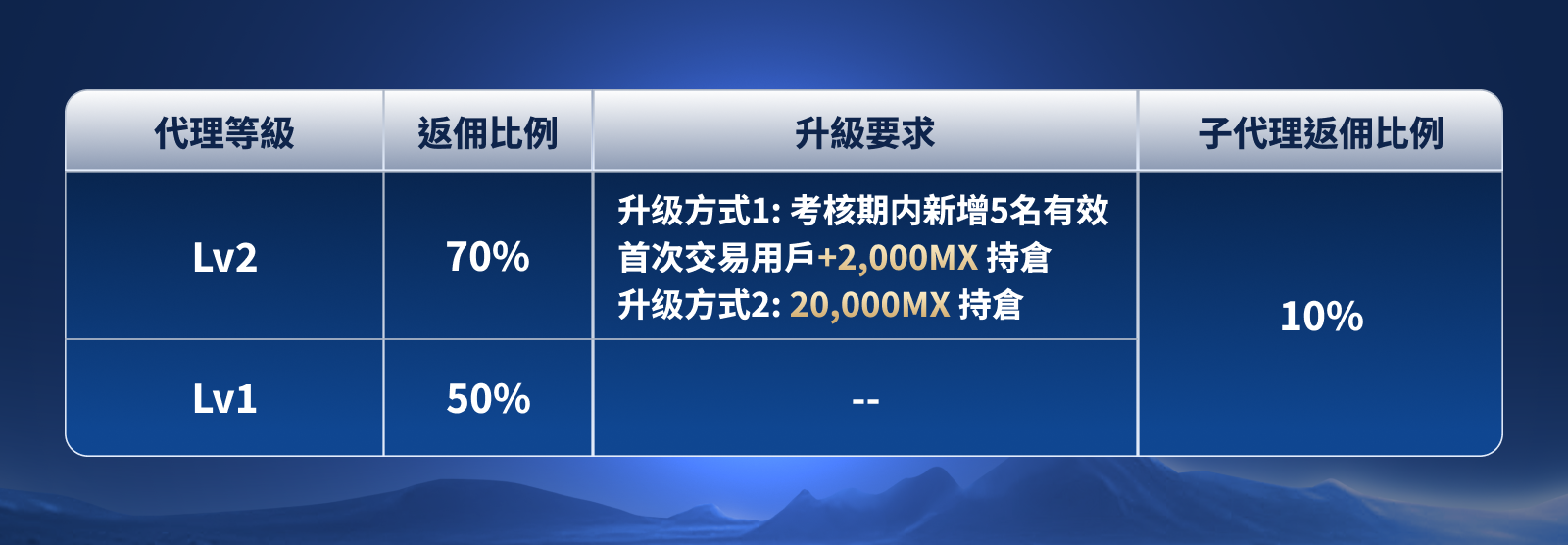 每個月分為兩個週期,分别是从 1 日到 15 日和从 16 日到 30/31 日。如果在當前週期內達成升級條件,下個週期的返佣等級將會自動升級到 2 級。如果未達成條件,返佣等級將會降回 1 級。升級條件如下: